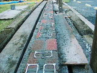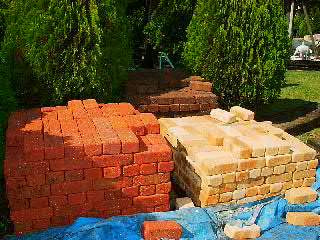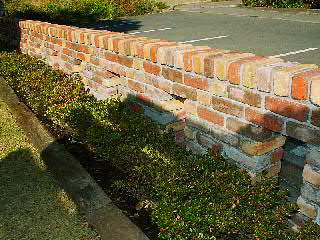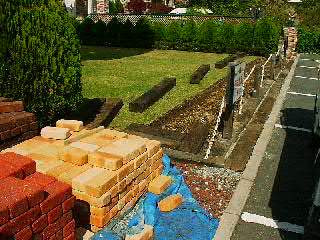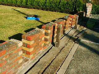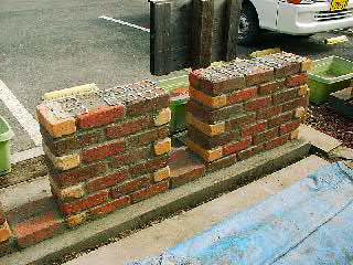 数年前まで枕木に熱中した時期がありましたが、この頃はレンガに興味が移ってきました。手始めに駐車場からエントランスの入口にレンガをねじりながら積んで対の門柱を作りました。トップに外灯を設置し、我ながらうまくいったと思いました。それに味を占めてもう少し大物をチャレンジしたくなり、ついに塀作りを思い付いたのでした。それは2003年10月のことでした。