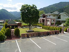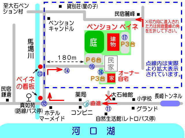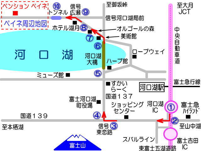 新宿駅(中央線特急 60分)→大月駅(富士急行線 52分)→河口湖駅(富士急行バス 芦川農産物直売所行き18分)→真如苑バス停下車(徒歩3分)→ペンションペイネ