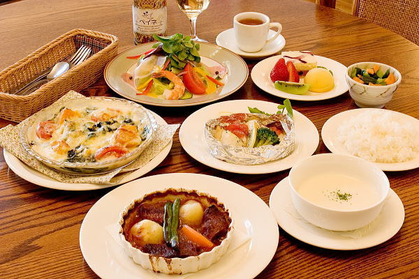 - 卵料理(きのこのキッシュやほうれん草のココット)