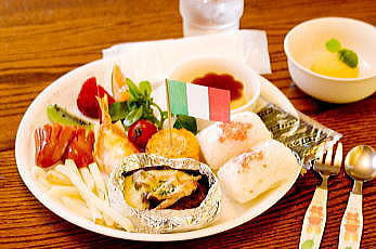 ある日のお子様用の夕食です。食べやすいようにワンプレートの盛り合わせ料理になります。食後にはデザートもご用意致します。