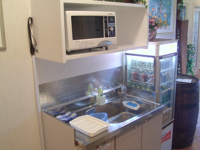 1階通路にありますので深夜でもお好きなお時間にご利用になれます。お湯も出るキッチン流し台と電子レンジを設置してあります。離乳食の調理や哺乳ビンの消毒にご利用下さい。引き出しの中には哺乳ビン洗いもございます。